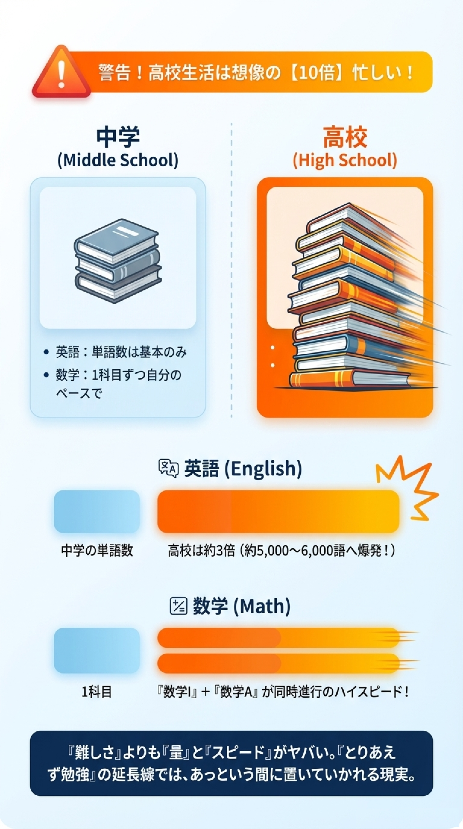 英語: 大学入試の単語数は中学の約3倍(5,000〜6,000語)。 高1から計画的に進める必要があります。