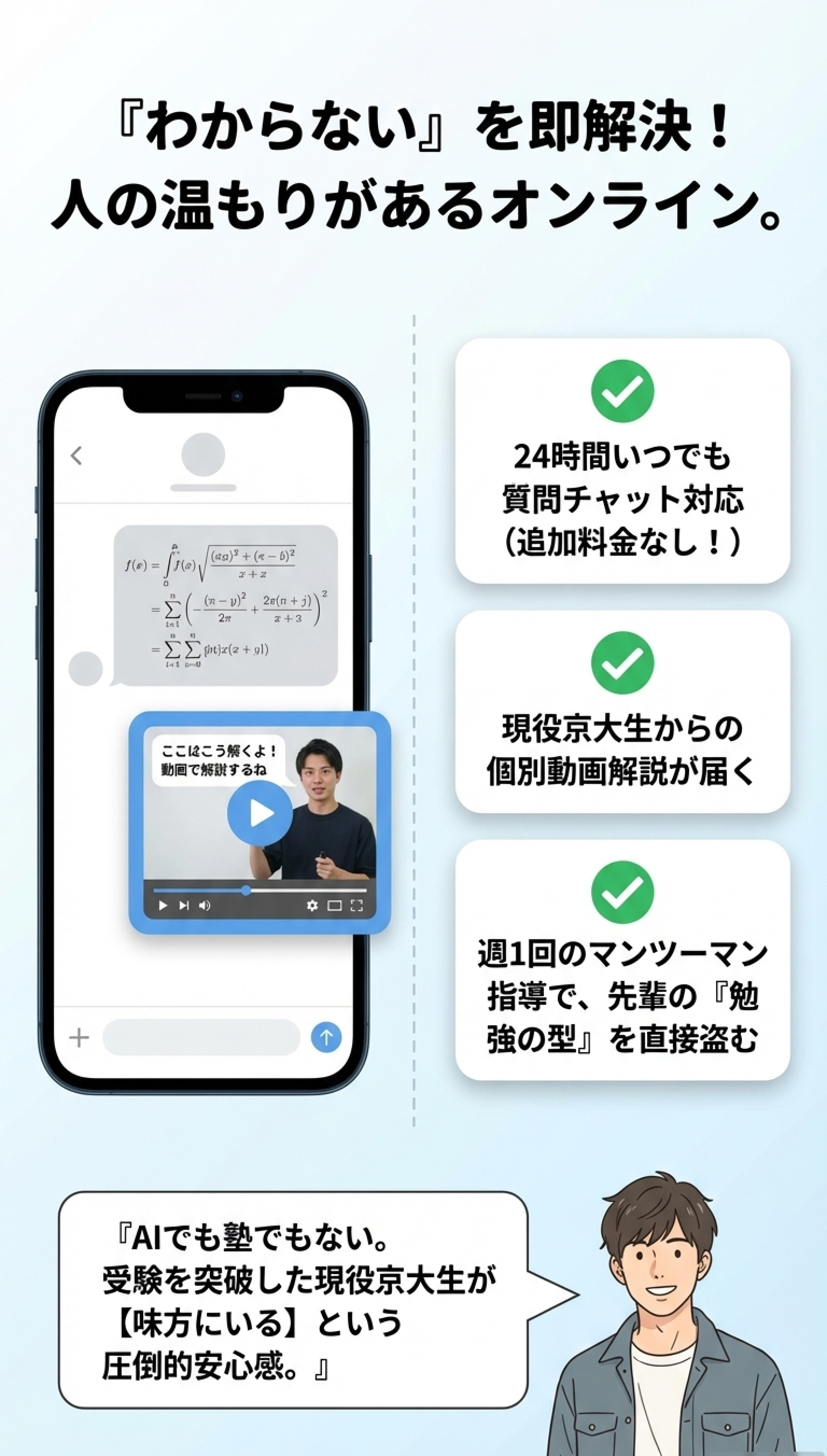 家で一人で勉強していて、分からない問題が出てきたとき。京大M予備なら、スマホで質問を送るだけで現役京大生から動画解説が届きます。 「わからない」を翌日に持ち越さないスピード感が、あなたの成績を劇的に変えます。