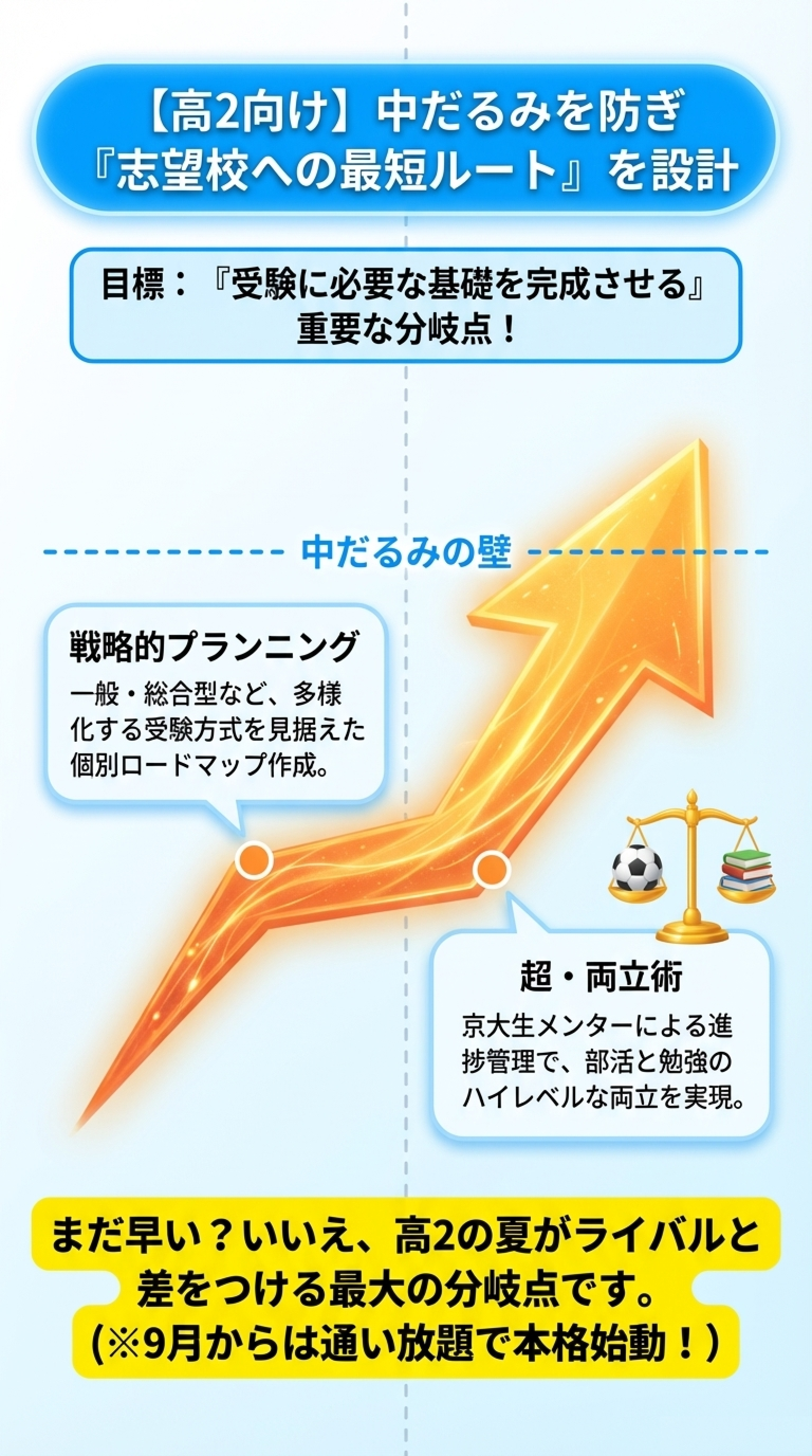 「部活が忙しくて勉強時間が取れない」という悩みも、40年の実績を持つプロが作成する学習プランで解決します。 一人ひとりの生活リズムに合わせ、「今、何をすべきか」を明確にするため、短い時間でも質の高い学習が可能です。